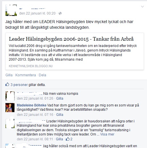 Den 22 januari kom det ett facebook inlägg i mitt flöde där det delades ett inlägg om att Leader Hälsingland har varit ”ett mycket lyckat projekt”.
